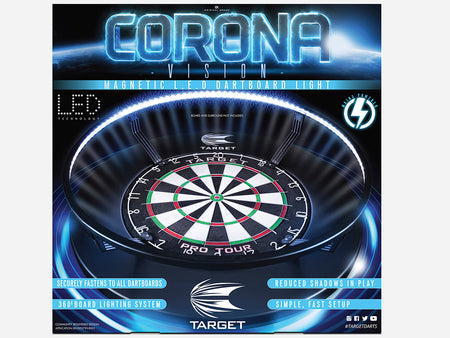 The corona lighting system is the new and more convenient way of lighting your dartboard. the feet of the corona are magnetic, allowing them to attach to the steel ring of the dartboard. you can use the corona with a dartboard and surround, dartboard cabinet set or just a dartboard on its own. the corona also works with any dartboard bracket. using 125 Individual LED lights, The corona lighting system illuminates your board and provides consistent light regardless of the ambient lighting in your room. The latest in LED technology also dramatically improves your vision of the board and with 360 degrees Of light The board is Virtually shadow less.