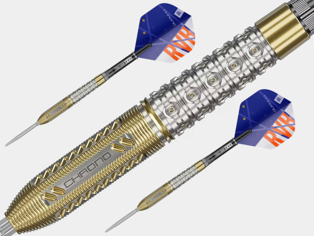 Collaboration with 5-time World Champion, "Barney", results in the sleek and refined Raymond van Barneveld Chrono darts, featuring gold PVD Titanium-Nitride accents. Precision-milled grip and tapered barrel design enhance performance while Swiss Point tips offer effortless switching for optimal precision.