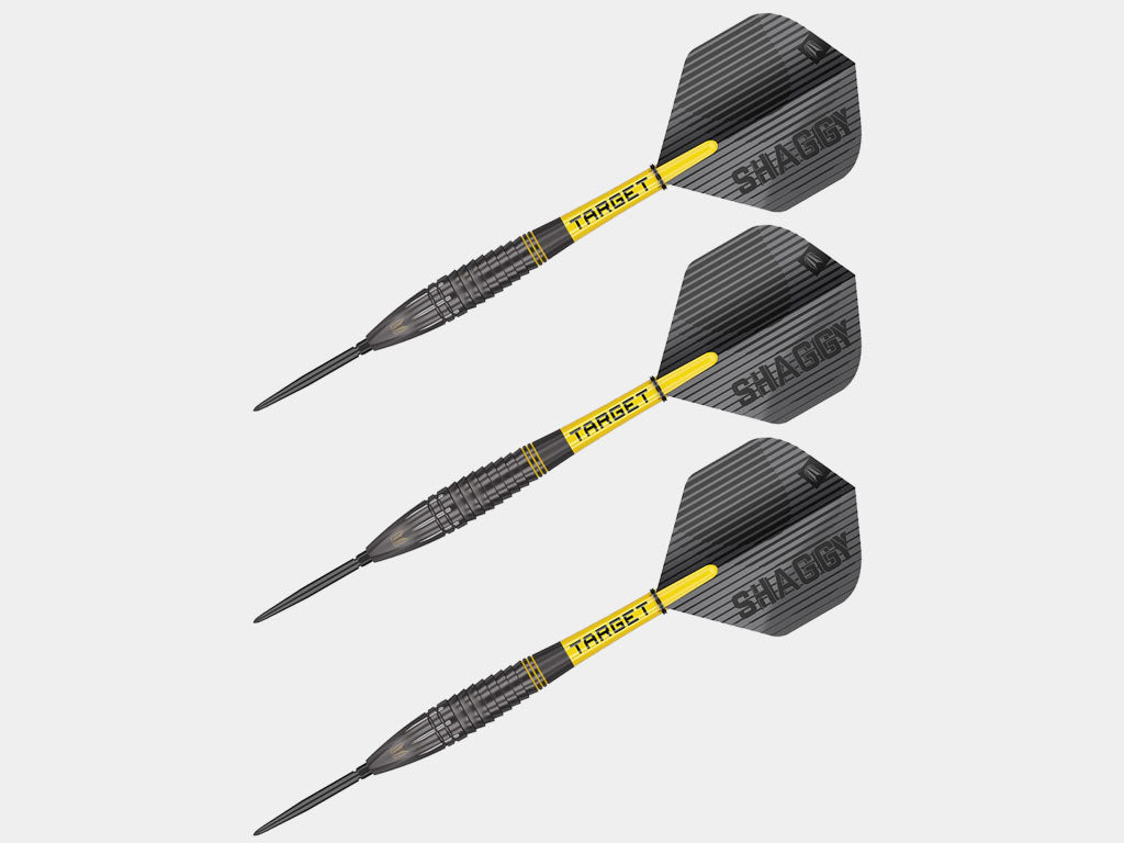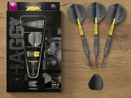 Unleash your potential with the Scott Williams Black Steel Tip Dart Set designed with player collaboration. The 90% Tungsten Barrel is crafted for balanced weight and precise accuracy, with black titanium nitride coating for durability. Radial grooves and a unique shape allow for dynamic and consistent throws, while the 26mm Black Swiss Point offers effortless point switching. The Pro Grip Shaft and Pro. Ultra No.2 Flights complete the set, providing durability and grip for all dart play styles.