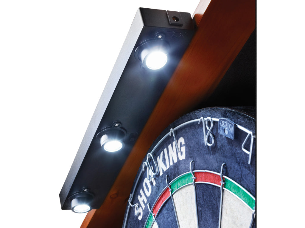 This cabinet mounted display light Illuminates your dartboard, enhancing our visibility and transforms your game room into a true centerpiece. It features 3 adjustable bright and energy efficient LED light pods, delivering a crisp, clear view at any distance